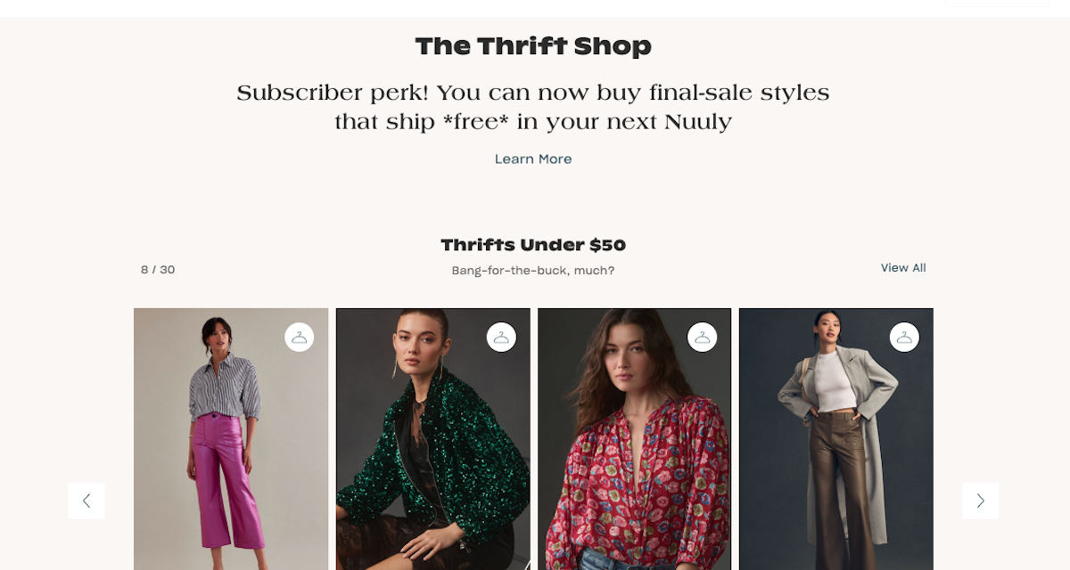 Nuuly, which launched in 2019, had more than 250,000 active subscribers at the end of its last quarter. Its members pay $98 a month for six pieces that they can wear and then send back. However, if subscribers want to keep an item included in their monthly rental haul, they can buy it piecemeal for a discount, “sometimes up to 75% off [the] retail price,” according to Nuuly. This offer remains going forward, even with the addition of Thrift Shop.