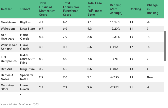The specialty retail cohort offered a mixed bag of financial performances. The beauty category saw major financial gains in 2023, particularly in e-commerce. Ulta benefitted from this trend and was a top performer, while Dick’s Sporting Goods and Chewy fell into the middle of the financial ranking. Barnes & Noble appeared in the bottom quartile of the index. Sephora’s parent company LVMH did not disclose full financial results at its most recent earnings, but said it achieved “remarkable growth.” Instead, Modern Retail+ Research used the average financial score as a proxy for its performance.
